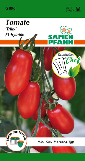 Solanum lycopersicum Tomate ’Trilly, F1-Hybride’ Mittelfrühe Mini-San Marzano Tomate, sehr ertragreich. Pflaumenförmige, tiefrote, sehr süße, saftige Früchte. Fruchtgewicht 20g. Pflanze bildet lange, fruchttragende Rispen. Resistent gegen Fusarium-und Verticilium Welke. Geeignet auch für Anbau im Topf auf Balkon und Terrasse.