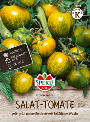 Die Tomate 'Green Zebra' ist eine Stabtomate mit kräftigem Wuchs und hohen Erträgen. Mit ihren ungewöhnlich gelb-grün gestreiften Früchten sticht sie heraus und bringt optische Abwechslung in die Küche. Von Februar bis April kann 'Green Zebra' vorkultiviert und ab Mitte Mai ins sonnige, windgeschützte Freiland gesetzt werden. Alternativ bietet sich eine Kultur im Gewächshaus an. Wässern, Düngen und Ausgeizen der Seitentriebe erhöhen die Erträge in den Erntemonaten von Juli bis Oktober.
