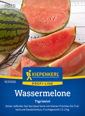 Die Wassermelone 'Tigrimini' bildet süße, rotfleischige, 1,5-2 kg schwere Früchte mit nur wenigen, kleinen Kernen. Dank Frühzeitigkeit und der geringen Fruchtgröße ist sie eine sicher reifende Sorte für geschützte Stellen im Freiland, Folientunnel und Gewächshaus.