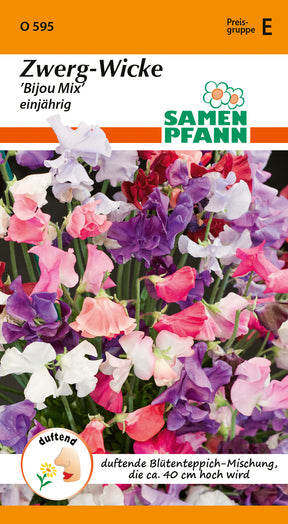Lathyrus odoratus Zwerg-Wicke ’Bijou Mix’ Diese einjährige Edelwicken-Mischung eignet sich aufgrund ihres niedrigen Wuchses (ca. 40 cm) optimal für Pflanzung in Töpfen oder Balkonkästen. Die Edelwicken verströmen einen angenehmen Duft und erfreuen durch ihre bunte Farbenvielfalt.