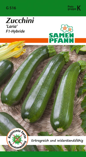 Cucurbita pepo Zucchini ’Laria’, F1-Hybride Ertragreiche Pflanze mit kurzen Trieben und feiner Maserung. Dunkelgrüne, glänzende Früchte mit viel Geschmack. Resistent gegen Krankheiten.