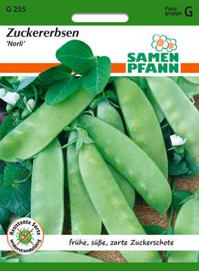Pisum sativum Zuckererbse ’Norli’ Sehr frühe, mittelgrüne fadenlose Sorte mit zarten schmackhaften Schoten. Kräftig wachsend, standfeste Pflanzen, ca. 50 cm hoch. Hoher Ertrag, vorzüglicher süßer Geschmack, die Hülsen werden im jungen Stadium, bei Beginn der Körnerbildung im Ganzen verzehrt. Für Frischverzehr und zum Einfrieren geeignet. Resistent gegen Fusarium Welke.