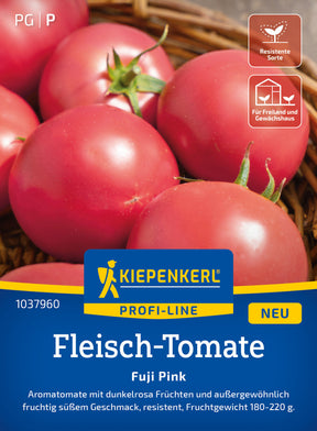 Die Fleischtomate 'Fuji Pink' bildet dunkelrosa-farbene, runde, 180-220 g schwere Früchte mit süß-aromatischem Geschmack. Geeignet fürs Gewächshaus, größere Kübel und für geschützte Stellen im Freiland. Resistent gegen verschiedene Welke- und Blattkrankheiten, Mosaikvirus und Nematoden. Wuchshöhe 150- 200 cm.