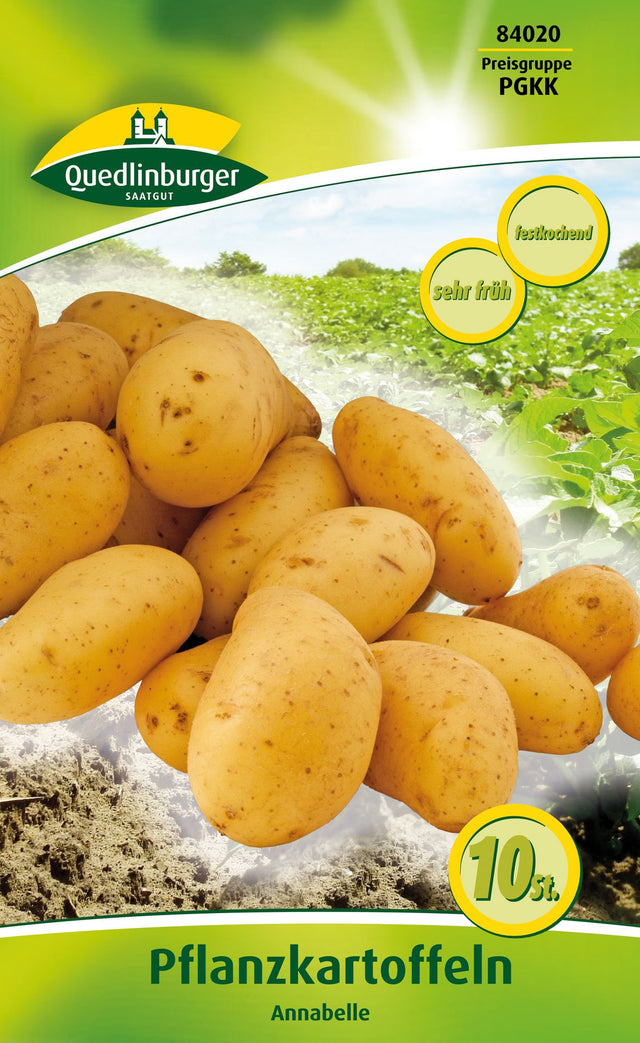 Die Quedlinburger Pflanzkartoffel 'Annabelle' ist eine sehr schmackhafte Frühkartoffel. Dünne und zarte, sowie glatte Schale - fein und zartes Fleisch. Geeignet als Bratkartoffel, für Kartoffelgratin, Kartoffelsalat, Ofenkartoffel, Pellkartoffel, Salzkartoffel.