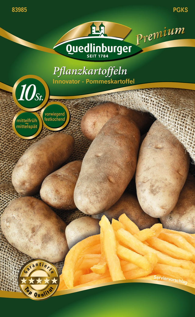 Die Quedlinburger Pflanzkartoffel 'Innovator' hat eine ungewöhnliche rostbraune Schalenfarbe. Hervorragender Geschmack. Im Anbau sehr robust, ertragreich, glattschalig, längliche Knollen. Geeignet als Pommes frites und als Grill-, Back- bzw. Ofenkartoffeln.