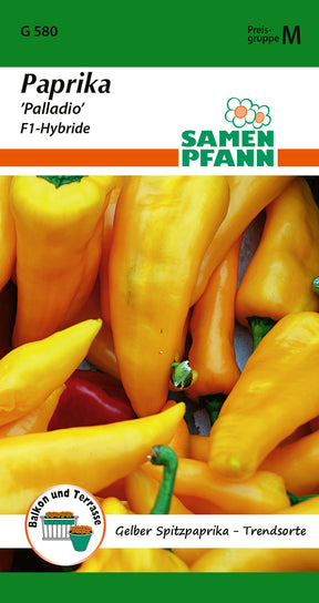 Capsicum annuum Paprika ’Palladio, F1-Hybride’ Mittelfrüher schöner Bullhorn-Paprika mit hohem Fruchtansatz, ca. 20-22 cm langen und 160-180 g schweren spitzen gelb ab reifenden Früchten. Süßer, milder Geschmack. Geeignet für Gewächshaus, Balkon und geschütztes Freiland. Sehr ertragreich.