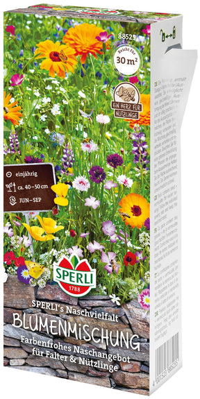 Die niedrige, farbenfrohe Sommerblumen-Mischung „SPERLI's Naschvielfalt“ schafft ein reichhaltiges Nahrungsangebot für Falter, Hummeln & Co. So begeistert der langanhaltende Blütenflor Mensch und Tier den gesamten Sommer über (Juni bis September). Die Mischung ist ideal geeignet für humose, nährstoffreiche Böden und sollte ab April an einem sonnigen bis halbschattigen Platz ausgesät werden. Tipp: Das Entfernen verblühter Pflanzen schafft Platz für neue Blüten. Die einjährige Mischung wird 40-50 cm hoch.